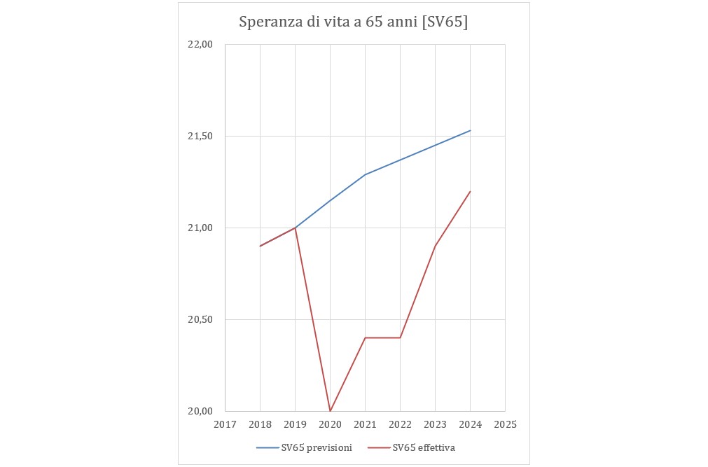 Secondo i dati Istat, dal 1980 al 2024 la speranza di vita a 65 anni è aumentata di circa sei anni, passando da 15,3 a 21,2. La crescita è stata quasi costante fino al 2015, salvo alcune flessioni dovute a variazioni nella mortalità della popolazione anziana. Il crollo del 2020, legato alla pandemia da Covid-19, ha segnato una riduzione di circa un anno rispetto all’anno precedente. Successivamente, il parametro è tornato su livelli pre-pandemici. Gli effetti della pandemia sono stati significativi anche sugli adeguamenti pensionistici: poiché la legge non consente riduzioni dell’età pensionabile, le variazioni negative (-3 mesi nel 2023 e -1 mese nel 2025) sono state di fatto neutralizzate, con requisiti rimasti invariati.