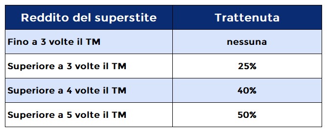 La pensione ai superstiti (reversibilità o indiretta) è soggetta a riduzioni percentuali in funzione dei redditi complessivi del beneficiario, salvo che la prestazione sia destinata a figli minori, studenti o inabili.